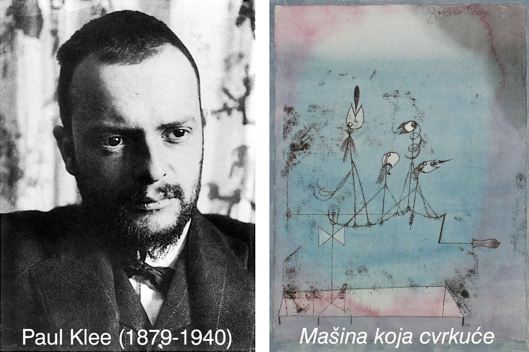 Kroz svoja djela Klee je iskazivao i stav prema napretku mašinskog doba, ličnost njegovog kova, koja se vraća prirodi, svojim izvorima, dječijem dobu, nije nalazila ništa pozitivno u tehnici koja mu je sve to oduzimala. Djelo „Mašina koja cvrkuće“ govori upravo o njegovom stavu prema mehanizaciji modernog društva. Prikazujući na slici degeneretsku pticu-mašinu, koja se naizgled čini lijepom, ocrtava zamku koju nam postavlja tehnika. Glave „ptica-mašina“ kao da su zamke za prave prirodne ptice, koje postaju žrtvama mašine. Preneseno na današnje vrijeme i ljudski stav, lako možemo uočiti koliko je bio u pravu. Globalnom kompjuterizacijom čovjek postaje mamac za mašinu koja će ga uništiti, ne u fizičkom nego u duhovnim smislu, čime gubi osnovne plemenite ljudske osobine –društvenost, osjećanja, humanost.